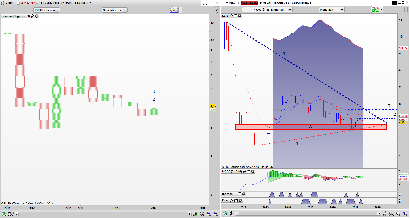 Im Mai hatte ich das letzte mal ein Auge auf den iShares S&P Clean Energy ETF (WKN: A0MW0M / ISIN: IE00B1XNHC34) geworfen. Seit dem ist im INRG Branchen ETF für Erneuerbare Energien nicht viel geschehen. Nach wie vor sind die Bären die dominierende Kraft, doch das ändert sich gerade.